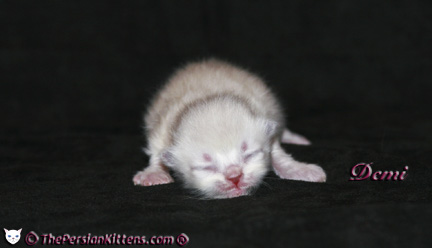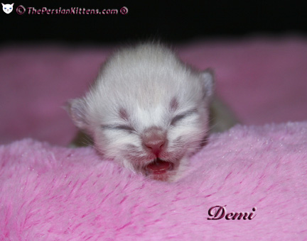 Persian Kittens © Demi is a petite lilac cream lynx point female. Demi has a sweet beautiful very round facel. Demi, the second himalayan kitten born, arrived at 9:11 am. She was a very healthy 101 grams. Demi will weigh @ 5.5 lbs fill grown. Demi is a very spunky, vocal petite little kitten. Demi and her sister Bibi are like little tomboys, and both aren’t hesitant to push their big brothers aside to get their milk! Demi loves to be groomed and kissed already. Every time she meows she gets kissed. She winces at light so she will open her eyes early. Both girls have big appetites-that shows good health and vigor. She will look like Rocky,Regan, Willow and Ella but her body and points will be much lighter. She will have big blue eyes that all our kittens have.