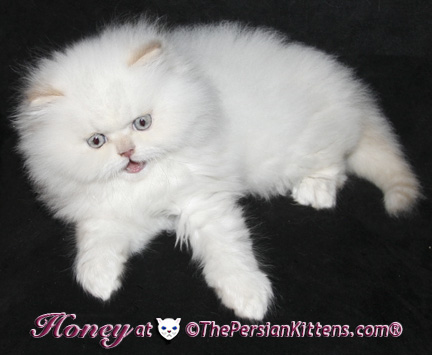Persian Kitten Honey is a male Cream Lynx Point Persian Himalayan Kitten. Born at 7:15 am and weighing a healthy 105g. Honey will be a small persian cat and will weigh 8~11 lbs. Honey wants to walk around, and can lift his head, he is a strong boy. Honey is determined to explore his new little world. Honey is a very spunky kitten, and can walk without his belly rubbing on the ground. Honey loves to be picked up, and kissed, he makes the cutest meows when I do. Honey loves to be touched. Honey has learned how to climb into bed with me. He comes by and licks my face and purrs. His cute round face and small ears, he will be gorgeous and he will look like both his parents! He will have huge Electric-Sapphire Blue eyes, that against his white fur will be outrageouly gorgeous! Honey will look like Rexx & Maxx .