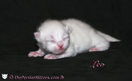Persian Kitten Leo is a male Cream Point Persian Himalayan Kitten. Born 9:27 am, Leo weighed 116 grams~ a very healthy weight. Leo is already an explorer, wanting to know what’s around him. Right after birth, he was sniffing and trying to navigate his new world. Leo will look just like his Daddy CH Maxi, Maxi Jr, Angel, Desi Rudy, Mojo, and older sisters Maxim and Priscilla. Leo will weigh @ 9-11 lbs. full grown.Leo has a nice sweet round face, purrfect proportions, and LOVES kisses!