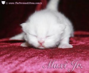 Persian Kittens® Maxi Jr the second born at 10:56 pm, and weighed 115 grams! Maxi Jr. is a cream lynx point male. Julianne named him after his Daddy for good reason-he looks so much like him already! Maxi Jr. was the first to purr-the first day! Maxi Jr. is very playful, and likes to explore and climb, he is a very strong little boy. Maxi Jr. is very talkative too, as he explores he talks (kitty meows). Maxi Jr. rolls on his back in my hand when I pet him, and moves his head for me to rub his chin. When I kiss his little face, he starts to lick my chin, he’s very affectionate and falls asleep in my hand. Both pretty boys are very alert at a young age. Watch a Video Clip of Maxi Jr. call “Maxi Jr.“!