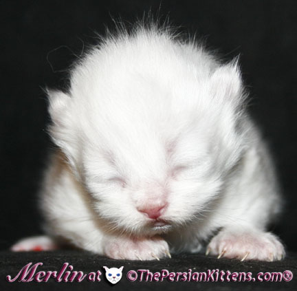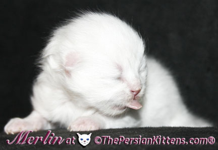 Persian Kitten Merlin is a female Cream Lynx Point Persian Himalayan Kitten. Merlin was the second kitten born at 1:00 pm and weighed a 125 g. Merlin will be a small to medium kitten and weigh of 5~7 lbs full grown. Merlin took his time being delivered, but as soon as she arrived she was ready to walk and nurse! Merlin purrs as she nurses. Merlin is so much like Cat. He has his daddy’s CH Maxi’s cute face and turned up nose. Merlin is already a talker. As soon as I touch her she meows. Merlin is a very alert confident kitten. Merlin likes to walk around. Merlin has a very outgoing personality! Merlin will grow to have the Champion winning looks of her Daddy CH Maxi. Merlin’s eyes will be big & very deep sapphire blue, against fluffy cream pointed, and white thick glossy fur with a thick mane like her Daddy CHampion Maxi will be beautiful. Merlin will look like Cherie & Lola.