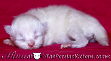 Our second little persian kittens girl Mina was the last born at 4:04 am. She was a very healthy 113 grams. Mina is a female lilac cream lynx point persian himalayan kitten. Mina has very pretty and delicate features. She will look like Rocky, Willow and Ella, with big blue eyes that all our kittens have.