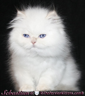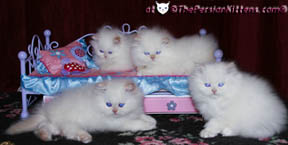Persian Cats CH Maxim & CH Fabian welcomed their beautiful Persian Kittens born in the early morning of Friday Nov 25, 2011. Both parents CH Maxim & CH Fabian are being very attentive to their kittens, constantly making sure they are well. This was one of the easiest births ever, no complications or problems! Our persian kittens are 3 Boys & 1 girl, Austin, Huckleberry, & Cherie, & Sebastian & their mini bios are listed below. The three boys and the girl are cream points persian kittens will be extremely light almost pure white persians with bright electric blue eyes. All four are healthiest kittens we have ever had! They had very healthy birth weights, and are nursing constantly growing stronger every day. These persian kittens were litter box trained at 4 ½ weeks. They are starting on solid food at 5 weeks old, they are very advanced. Each persian kitten page has their pictures (click any thumb picture to enlarge).