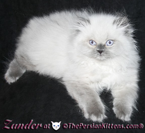 Persian Kitten Zander is a male Lilac Point Persian Himalayan Kitten. His parents are CH Maximillian & Coco. Born at 2:45 pm, and weighing a heavy 121 g. Zander will be a medium to large persian cat and will weigh @ 8-11 lbs. like his daddy CH Maximillian. He loves to be held and kissed. He meows for attention and loves all the attention all the aunts and uncle gives him. He is displaying affection early, and purs loud. Zander is a very active and curious little boy, he is always walking around. Zander is a strong boy. Zander is a very confident, laid back kitty. Zander has a very cute and very round face with chubby cheeks-he will be gorgeous and look like both his parents! He will have Electric-Sapphire Blue eyes, that against his very thick White fur and Cappuccino pointed fur will be outrageously gorgeous! Zander will look like our CH Rocky with a rounder face. He loves to sleep & snuggle with me. He purrs as soon as I touch him. He loves to be groomed!!!