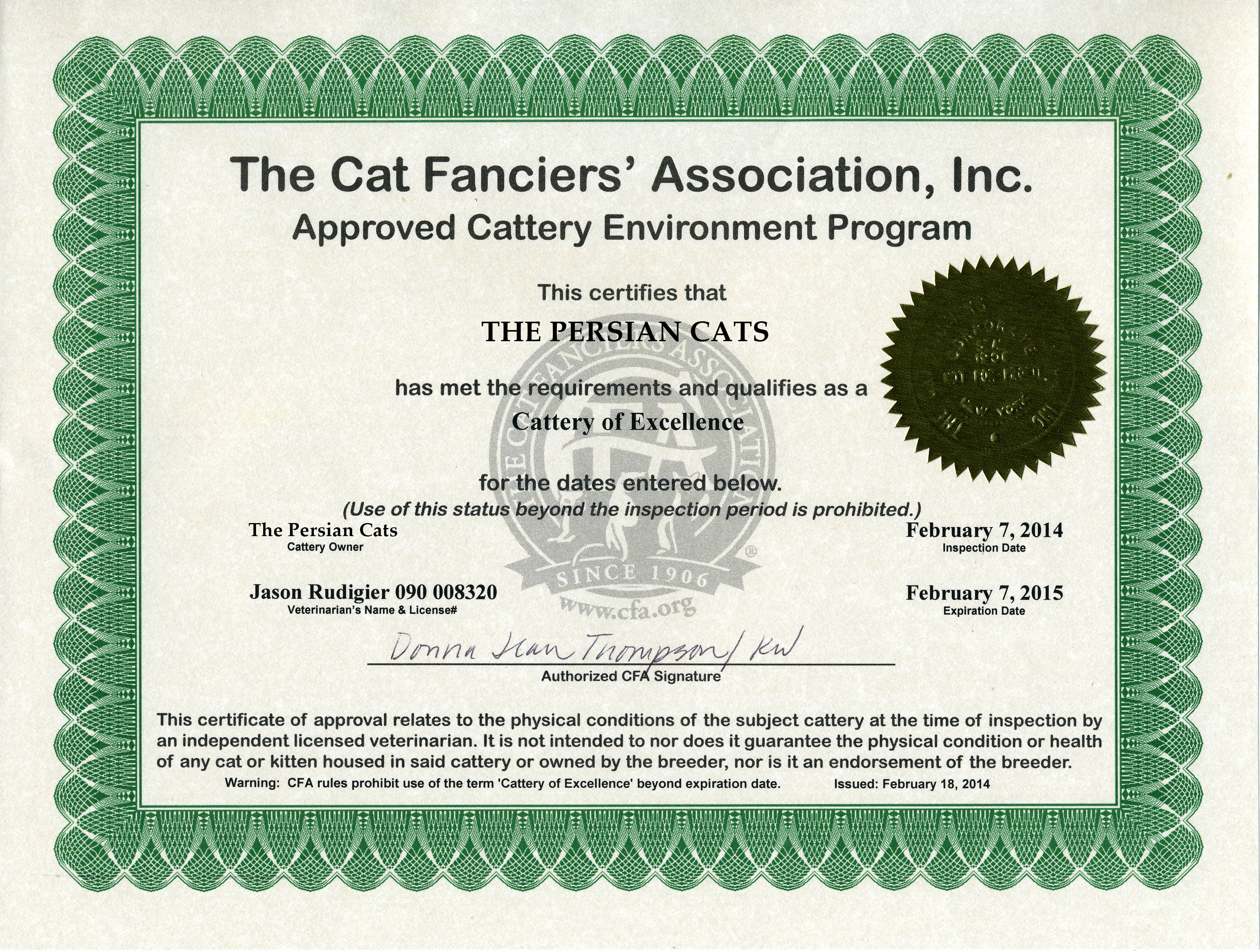 Persian Kittens® Cattery of Excellence Certification! Excellence for 11 Consecutive Years!