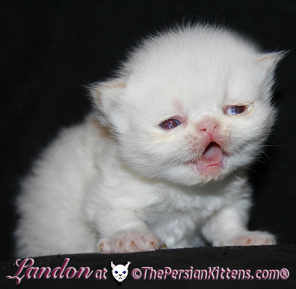 Persian Kitten LANDONPersian Kitten Landon is a male Cream Point Persian Himalayan Kitten. Landon was the last kitten born at 11:13 am and weighed a 104 grams the second largest in this litter. Landon will be a very healthy weight of 10~13 lbs. Landon has his mommie’s Pretty Petulia’s cute face and turned up nose. Landon is a very active kitty. He is a talker. He let’s his mommie know when he is hungry! Landon will talk each time I kiss his little face! Landon likes it when I kiss his face. Landon likes to follow me around. He likes to kiss my ankles, he is very sweet.He likes to watch me weigh all the kittens and write down the weights in my journal. He watches all my moves and grabs my pencil to smell it. He is so smart. Landon will grow to have the Champion winning looks of his Daddy CH Maxwell & Pretty Petulia, but will look more like his mother Petulia. Landon’s eyes will be big & very deep sapphire blue, and glacial white thick glossy fur with a thick mane like his Daddy CHampion Maxwell. Landon will look like Bentley & Maxx. If interested in adopting Britt sign our Newsletter/Adoption Form. We will get back to you asap.