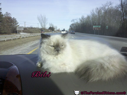 Just wanted to keep you updated on the sweet little baby girl you brought us a month ago….she’s WONDERFUL! Bibi has brought us so much pleasure, she is so cute and gorgeous. We had wanted a kitten for a long time, we had went to a pet store and there were two white persian cats, but you had to adopt both and well, we only wanted one. We looked around the internet and kept coming back to your site because you can tell by reading all the information, that these kittens (and cats) are more your family than a business and that you want others to get as much love and enjoyment from these “babies” as you do. We so enjoyed the pictures of Bibi as she grew and as you will see, she has gotten even prettier as the weeks have gone by! Bibi has surpassed our expectations….when she needs to use the litter box she does, she has never had an accident. She follows sometimes, and loves to be around us (doesn’t matter who, she is friendly to everyone). She is so playful, she keeps us laughing all the time. She loves to sleep after eating or playing alot. Many times she comes into the computer room and climbs up to be on the desk. She is such a character, trying to catch things that move on the monitor; then, she takes a nap on the desk (or as you can see, almost in the printer!). Another of her favorite places to sleep is on the kitchen chairs, after finishing her breakfast in the morning. We have brought her in the car almost every weekend and she likes to settle in the back window…. people probably think she is a childs stuffed animal because she is so fluffy and perfect.