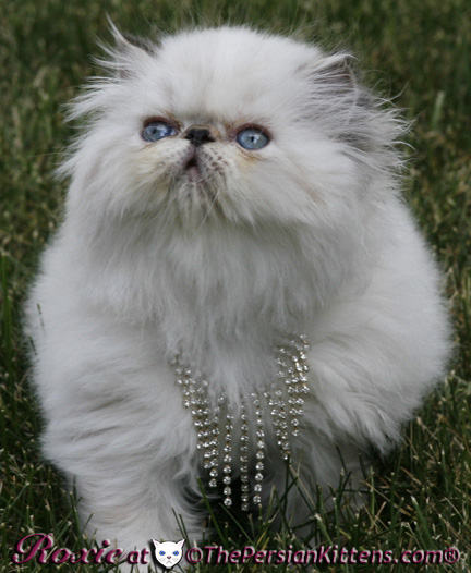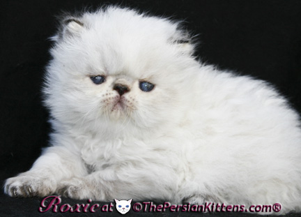 Persian Kitten Roxie is a female Lilac Cream Point Persian Himalayan Kitten. Her body will be white, and her Points (tips of ears, nose, featering through the tail & her paws) will have the Lilac Cream color. Roxie is the second kitten born at 2:30 pm and weighed a healthy 91 g. Roxie has her daddy’s CH Maxwell’s cute face and turned up nose. Roxie is active & likes to explore, and crawl around the room. Roxie is the first to to put her little head for kisses & purrs. Roxie purrs while she nurses, it’s such a little purr and very cute. Roxie is a very sweet & confident kitten. Roxie is very talkative, as soon as she was born she was talking!!! Roxie will grow to weigh a petite @ 5 lbs. She will have the Champion winning looks of her Daddy CH Maxwell, but will have her mommie’s coloring, a white body and lite cappuccino touches of color on the tip of her ears, nose,and hers tail.