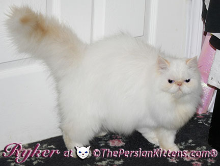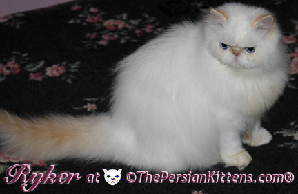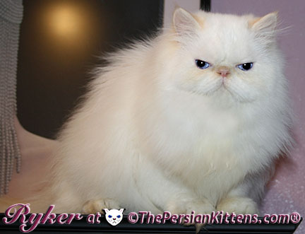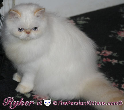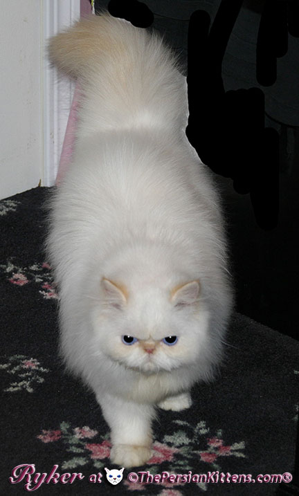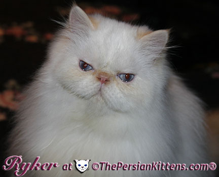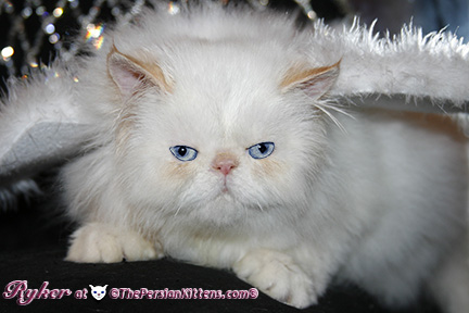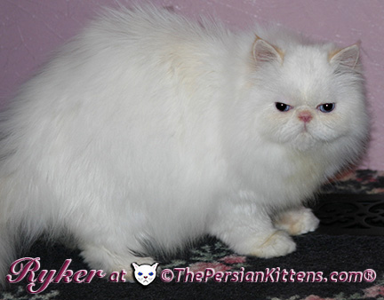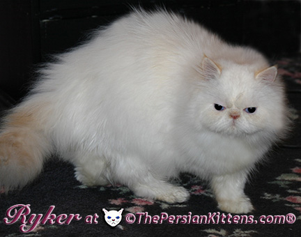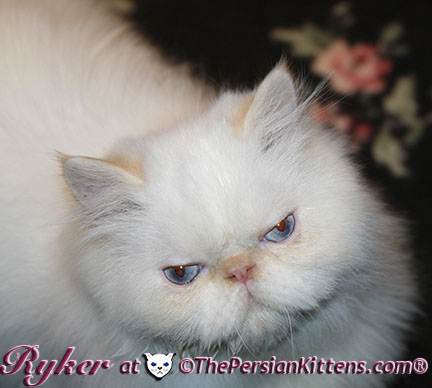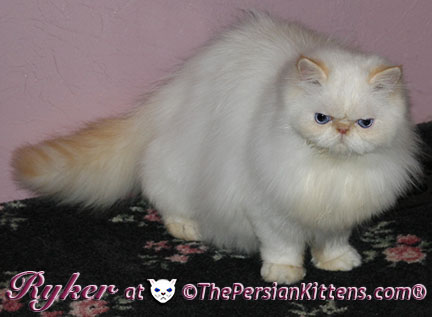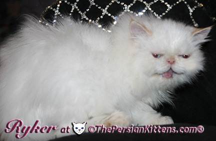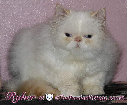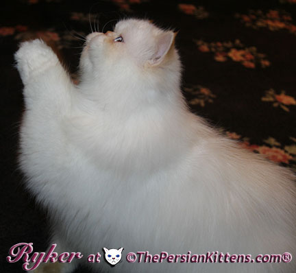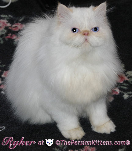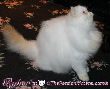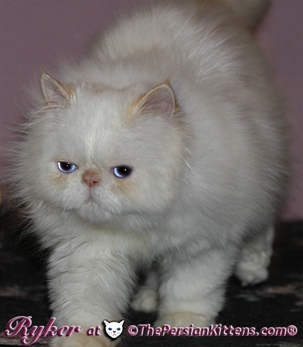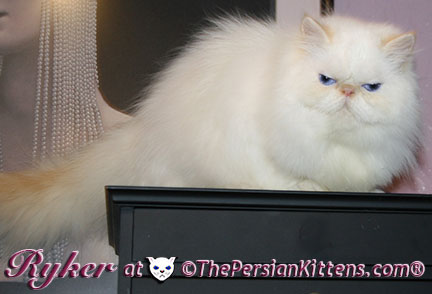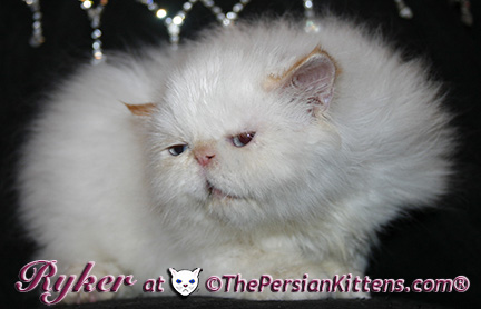 Persian Kitten Ryker is a male Long Hair Exotic Cream Point Exotic Persian Himalayan Kitten. Ryker was the second born at 3:30 am, and weighed a tiny 68 grams. He will weigh 8~11 lbs. as a full grown persian cat. He was a very tiny weight. However when he latched onto a nipple that was his. It was Petulia’s biggest nipple! He wil be a medium persian cat @ 8~10 lbs. Ryker will look almost pure white like his CH Daddy Maxwell. Ryker is already sweet and likes my kisses, and will suck on my lip. He loves his mommie and meows when his mommie Petulia grooms him. He is a happy, playful kitten. He is so sweet and purrs while he nurses. He likes me to rub his belly. Ryker was the first kitten to climb the pet stairs next to my bed. When he made it to the top and saw me he had the cutest look on his face and immediatelty came over to me and gave me kisses. From then on he sleeps next to me. Ryker is a very playful kitten. Even when I pet him, he purrs and grabs my hand with all his paws and rolls around, it’s very endearing. It’s amazing that Ryker was such a tiny kitten, because now when I ‘m in the basement sitting and cutting up the chicken breast, Ryker eats the pieces faster than I can cut it. Ryker has his mommie Petulia’s face and pretty big blue eyes & will have his daddy’s CH Maxwell’s thick soft fur. He will be gorgeous & very fluffy white! Ryker’s Grand Fathers on both his Mother’s side, and his Father’s side are Grand Champion and Regional Winners! Ryker will look like Rexx, & Dale.